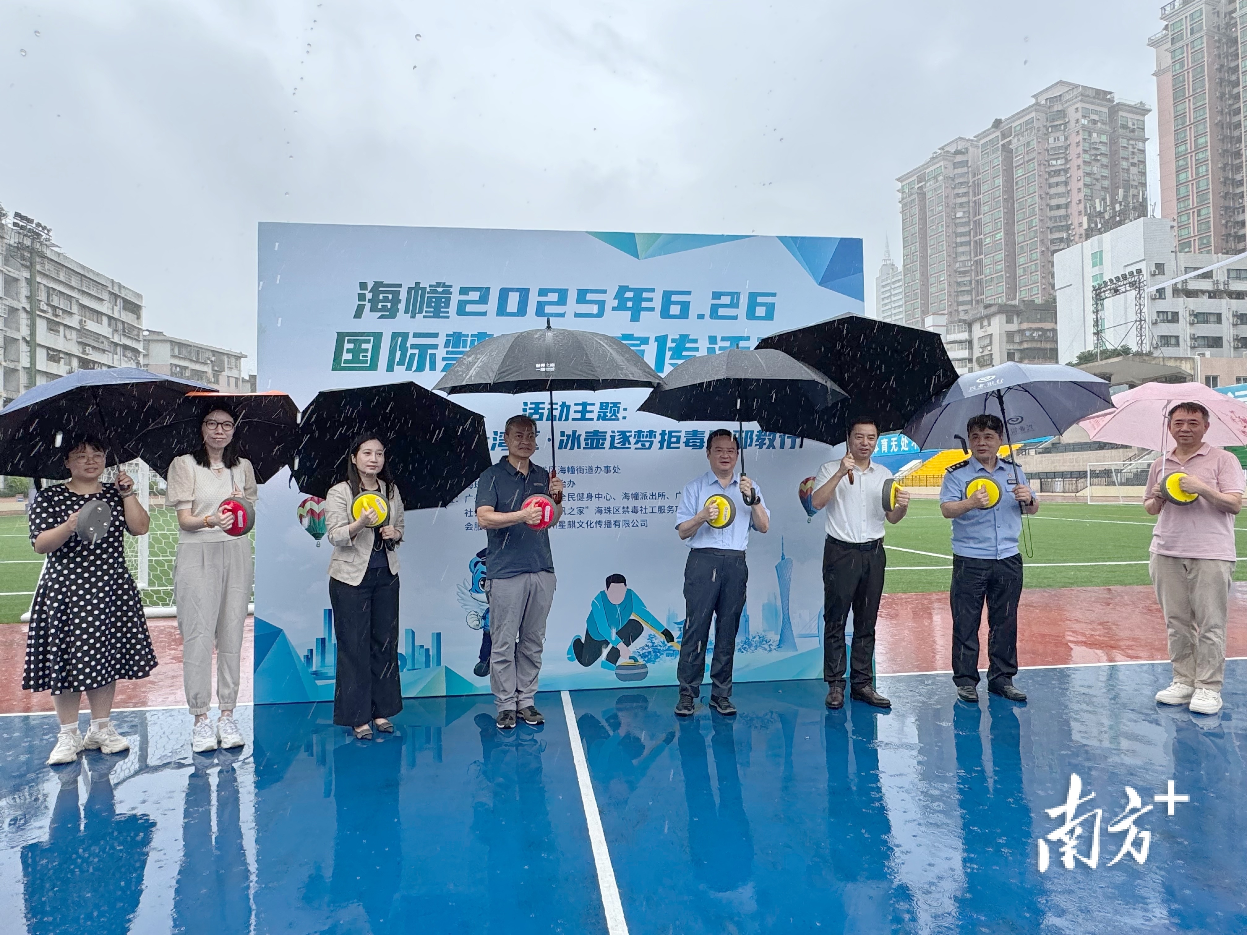 2025年6月26日是第38个国际禁毒日,广州市海珠区海幢街道积极响应国家禁毒号召,把禁毒事业与全民健身运动相融合,以“禁毒+体育”的形式践行禁毒理念,迎接全运会。6月17日上午,“十五运燃情大湾区·冰壶逐梦拒毒反邪教行”——2025海幢6·26国际禁毒日宣传活动在宝岗体育场举行。海珠区公安分局禁毒大队副大队长陈国徽受邀参加活动,海幢街道党工委书记陈志坚、办事处主任张玮、党工委副书记李珊,海幢派出所所长冯荣炜等领导和嘉宾出席。海幢街道干部职工、海幢辖区各企事业单位代表、禁毒协会成员单位代表、居民群众一百余人冒雨参加了此次活动。